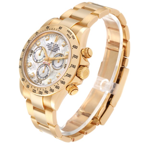 | Model Name: | Rolex Daytona Yellow Gold Mother of Pearl Diamond Dial Mens Watch 116528 |