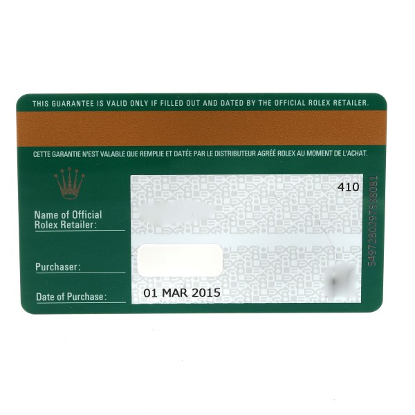 | Box & Papers: | Rolex box and card. |