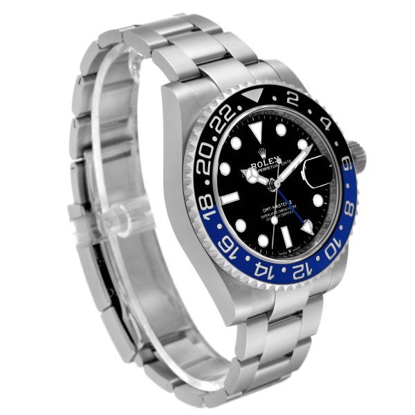| Bezel: | Stainless steel bi-directional rotating bezel with black and blue "Batman" ceramic insert. Engraved with 24-hour GMT scale. |