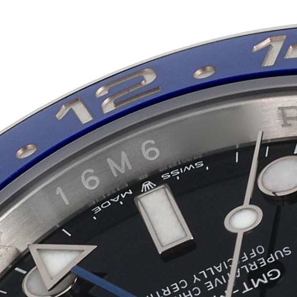 | Bezel: | Stainless steel bi-directional rotating bezel with black and blue "Batman" ceramic insert. Engraved with 24-hour GMT scale. |