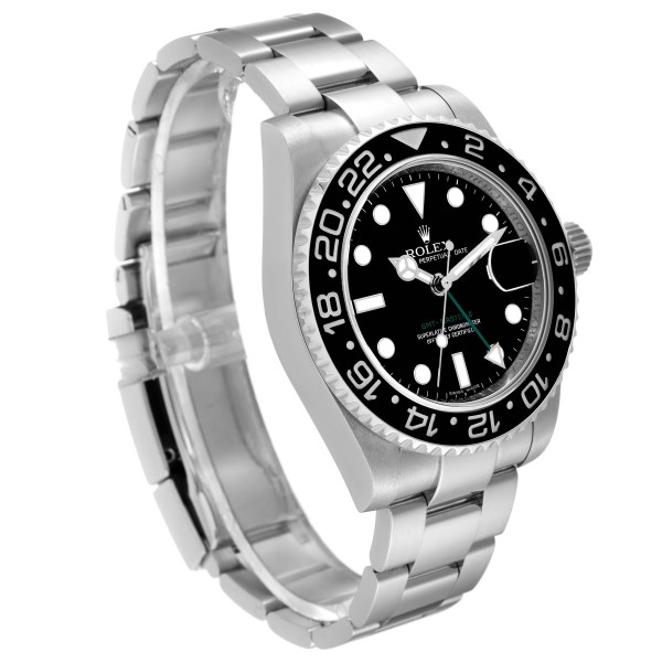 | Dial: | Black dial with white luminescent hour markers and Mercedes hands. Green GMT hand. Date window at 3 o'clock aperture. |