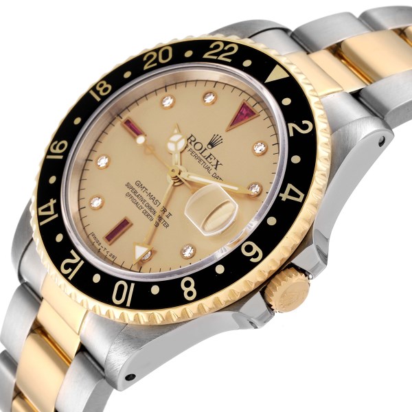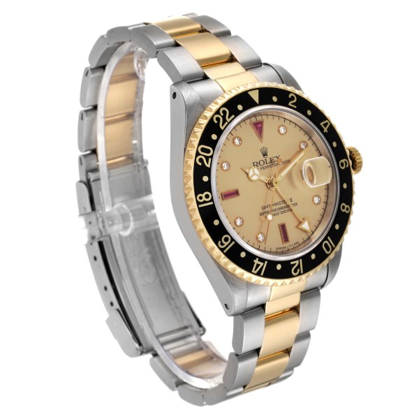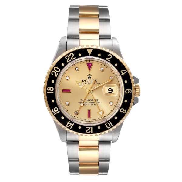 | Model Name: | Rolex GMT Master II Diamond Ruby Serti Dial Steel Yellow Gold Mens Watch 16713 Box Papers |