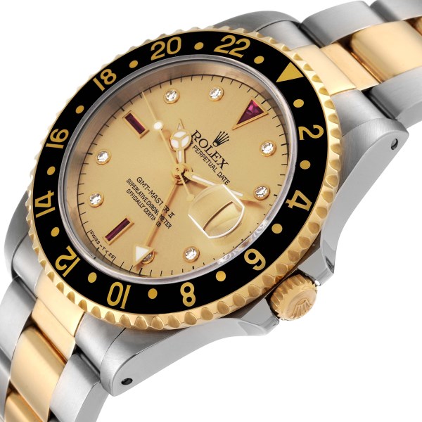 | Model Name: | Rolex GMT Master II Diamond Ruby Serti Dial Steel Yellow Gold Mens Watch 16713 |