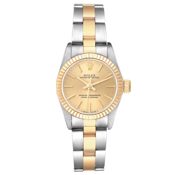 | Model Name: | Rolex Oyster Perpetual Yellow Gold Champagne Dial Ladies Watch 67193 Box Papers |