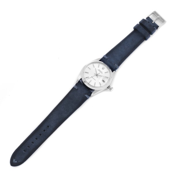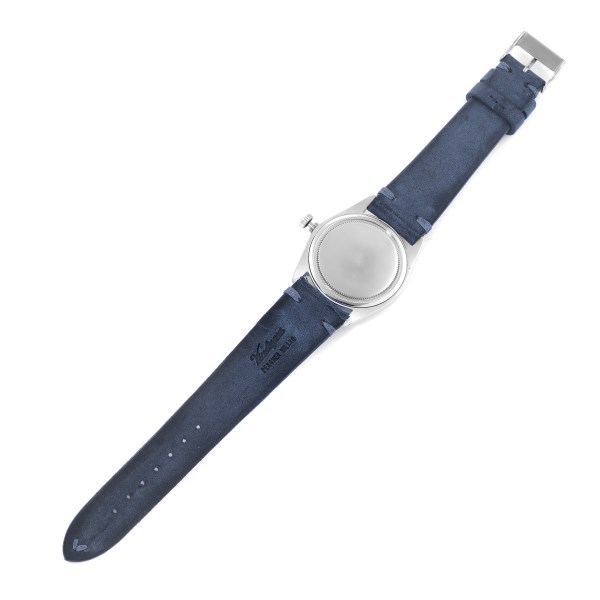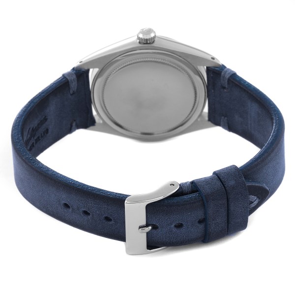 | Bracelet: | Custom navy blue leather strap with stainless steel tang buckle. |