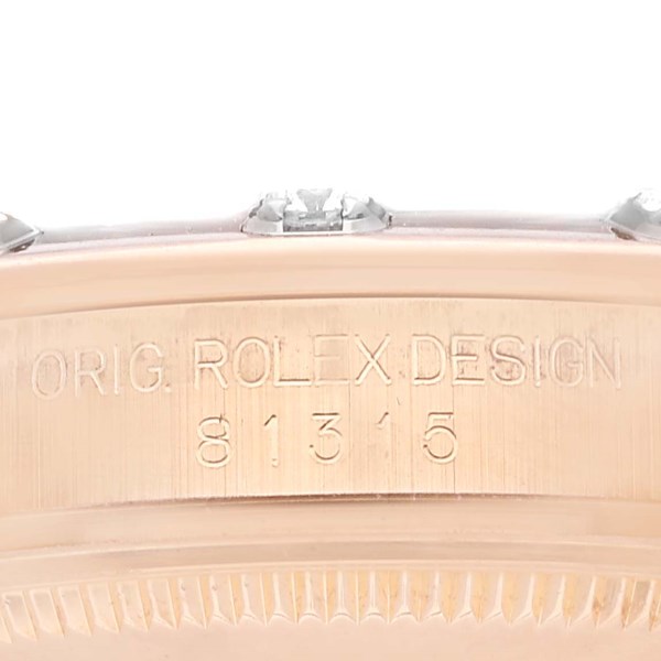 | Bezel: | 18k rose gold bezel set with 12 original Rolex factory diamonds. |