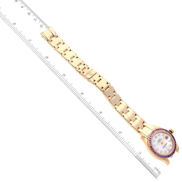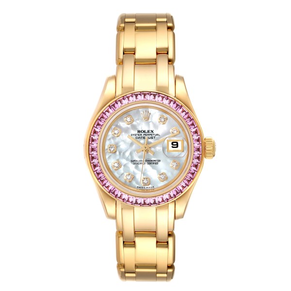 | Model Name: | Rolex Pearlmaster Yellow Gold Mother of Pearl Diamond Pink Sapphire Ladies Watch 80308 |