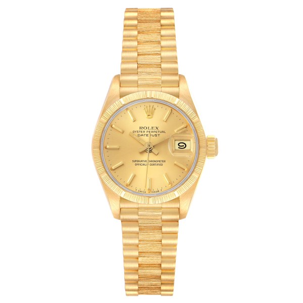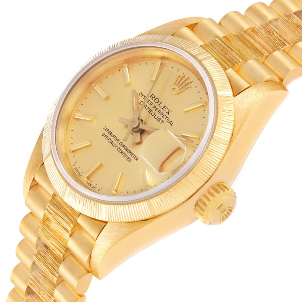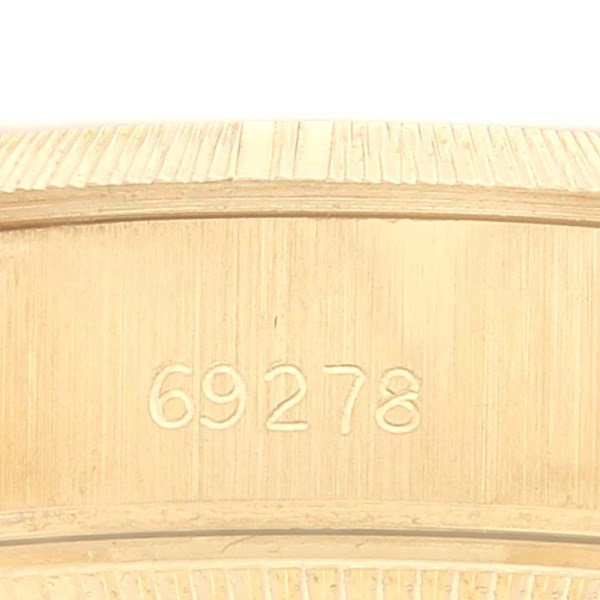 | Model Name: | Rolex President Datejust 18K Yellow Gold Bark Finish Watch 69278 Papers |