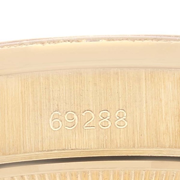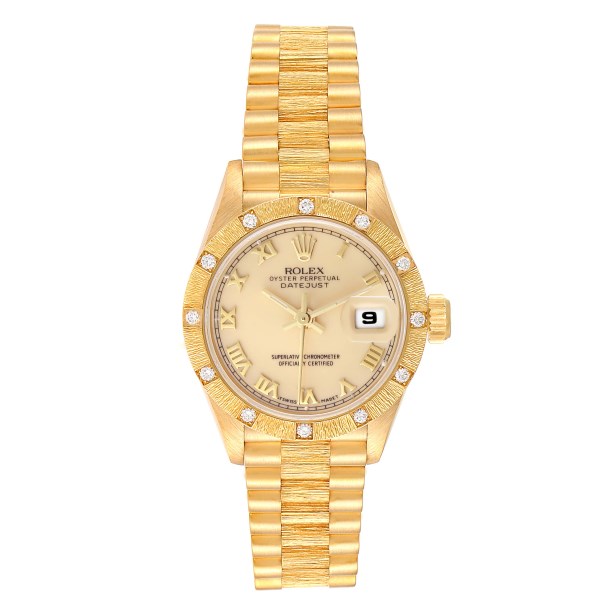 | Model Name: | Rolex President Datejust Yellow Gold Bark Finish Ivory Dial Ladies Watch 69288 |