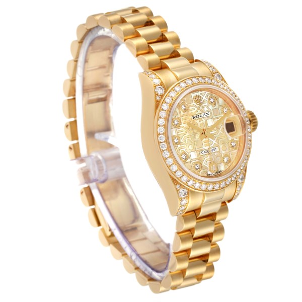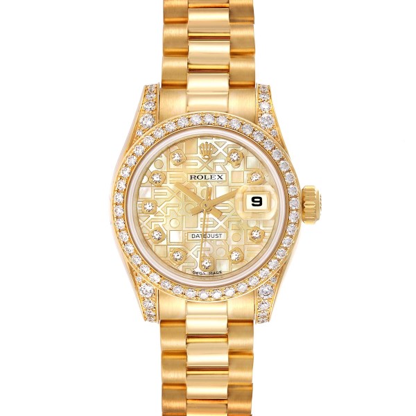 | Model Name: | Rolex President Datejust Yellow Gold Diamond Dial Bezel Lugs Ladies Watch 179158 |