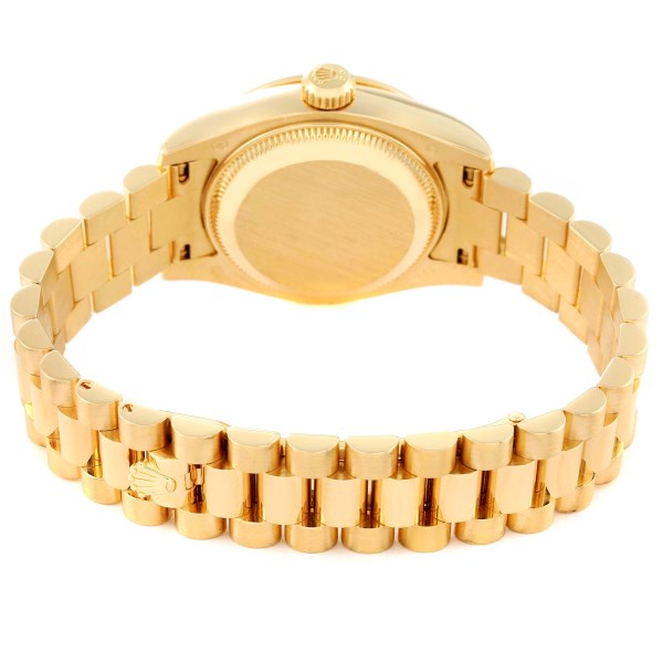 | Case: | 18k yellow gold oyster case 26.0 mm in diameter. Rolex logo on the crown. Original Rolex factory diamond lugs. |