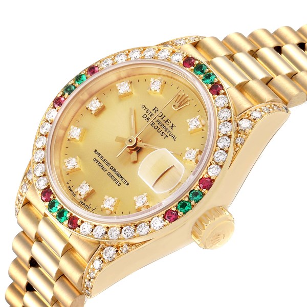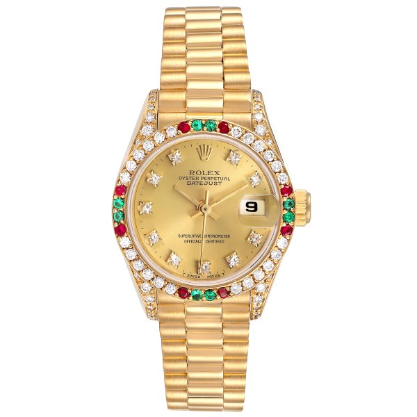 | Model Name: | Rolex President Datejust Yellow Gold Diamond Ruby Emerald Ladies Watch 69038 |