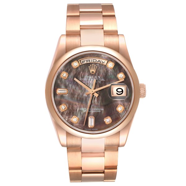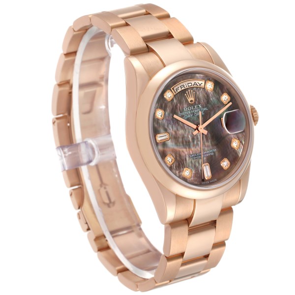 | Model Name: | Rolex President Day Date Rose Gold Mother of Pearl Diamond Dial Mens Watch 118205 Box Papers |