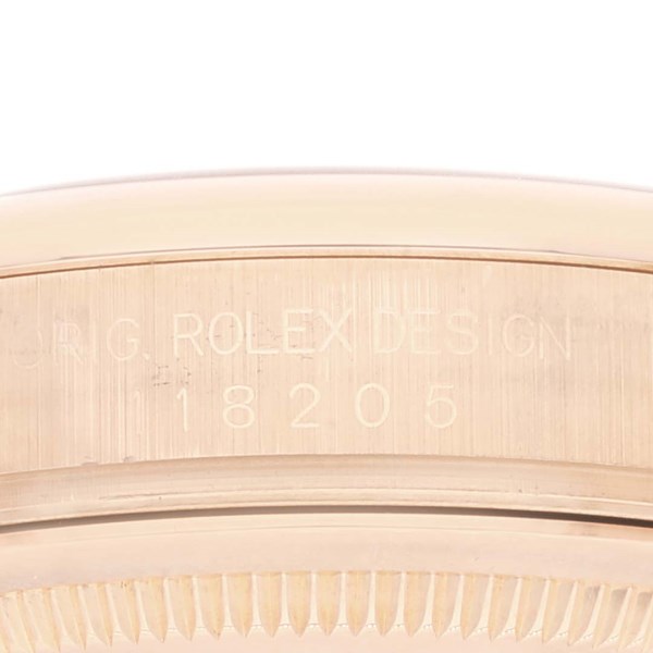 | Case: | 18k rose gold oyster case 36.0 mm in diameter. Rolex logo on the crown. |