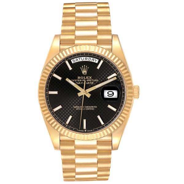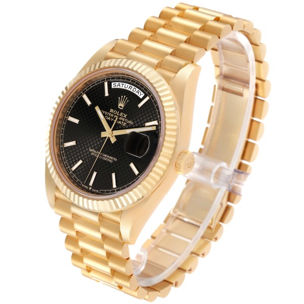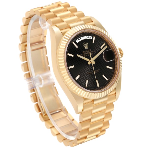 | Dial: | Black dial with diagonal motif pattern. Luminous yellow gold baton hour markers. Day window at 12 o'clock. Date window at 3 o'clock. |