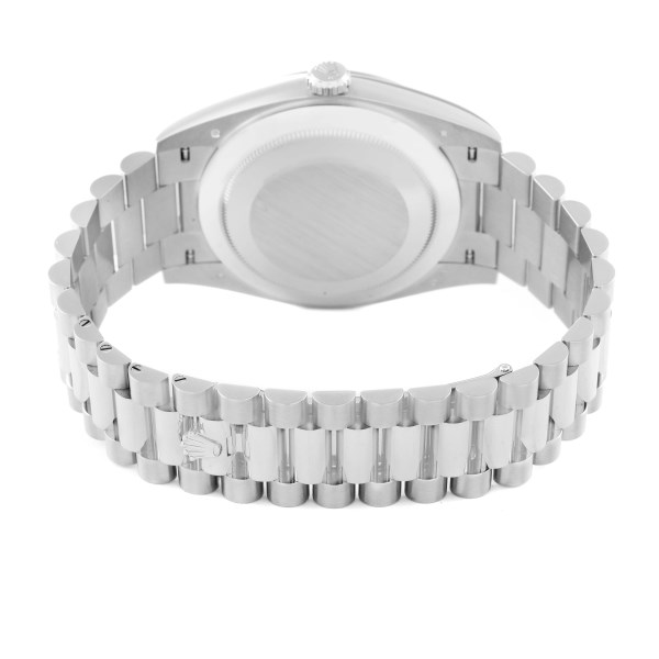 | Bracelet: | 18K white gold president bracelet with hidden deployant clasp. Fits 8" wrist |