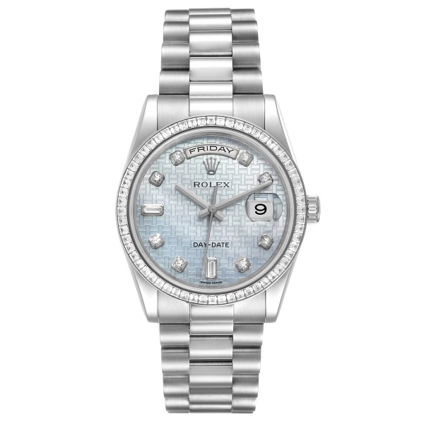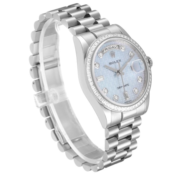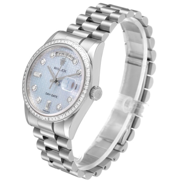 | Model Name: | Rolex President Day-Date Blue Mother of Pearl White Gold Diamond Mens Watch 118399 Box Card |