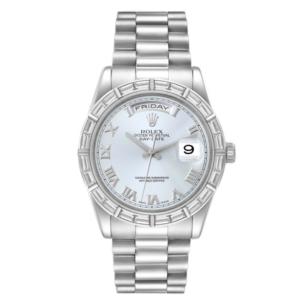 | Model Name: | Rolex President Day-Date Platinum Ice Blue Dial Diamond Bezel Watch 118366 Box |