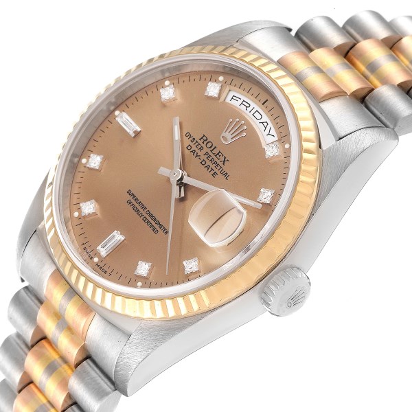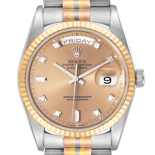 | Model Name: | Rolex President Day-Date Tridor White Yellow Rose Gold Diamond Mens Watch 18239 |