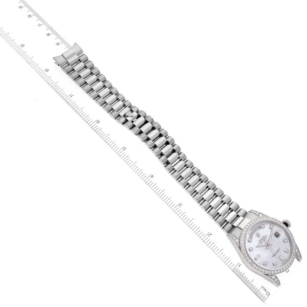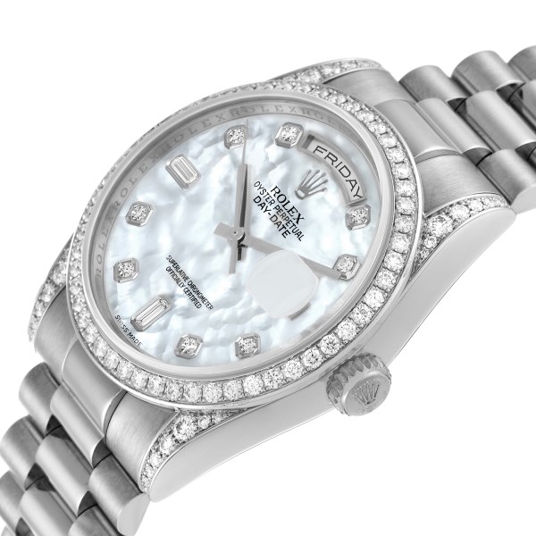 | Model Name: | Rolex President Day-Date White Gold Mother of Pearl Diamond Mens Watch 118389 Box Card |