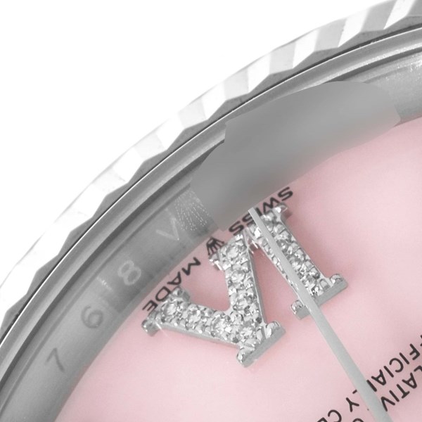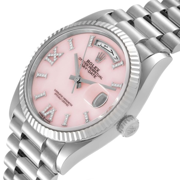 | Dial: | Pink opal stone dial with original Rolex factory diamond set Roman numeral hour markers. Sweep center seconds. Outer minute and 1/2 seconds divisions, aperture for day at 12, aperture for date at 3. Arabic Day and Date wheels. |