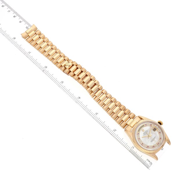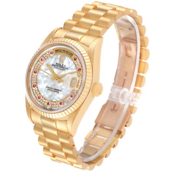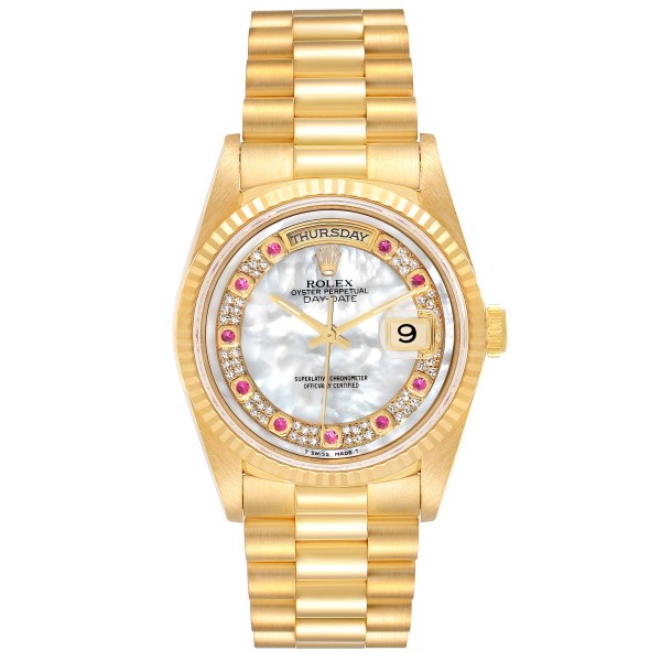 | Model Name: | Rolex President Day-Date Yellow Gold Mother of Pearl Diamond Ruby Myriad Dial Watch 18238 Box |