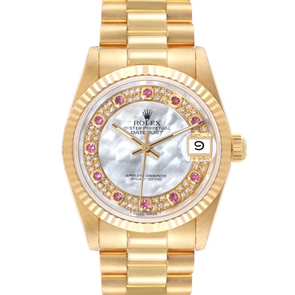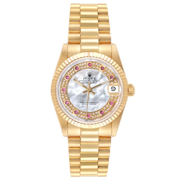 | Model Name: | Rolex President Midsize Yellow Gold Mother of Pearl Ruby Myriad Dial Ladies Watch 68278 |