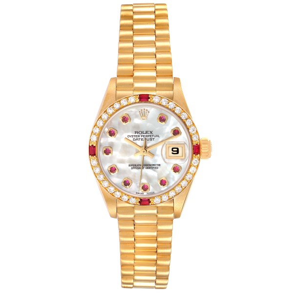 | Model Name: | Rolex President Yellow Gold Mother of Pearl Diamond Ruby Ladies Watch 69068 |