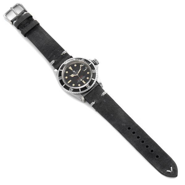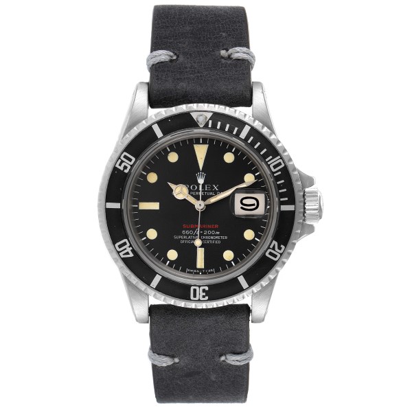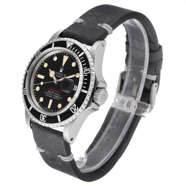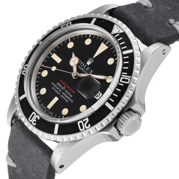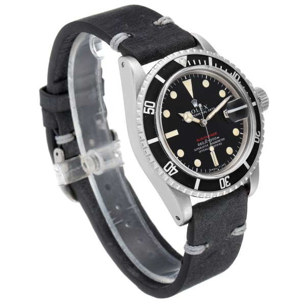 | Dial: | Black Mark IV dial with luminous round, triangular and baton indexes, outer minute/seconds divisions, aperture for the date. Luminous steel skeleton hands. Beautiful patina. Submariner sign in red. |