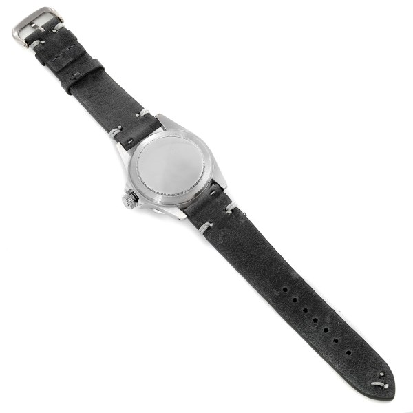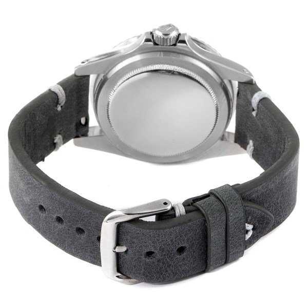 | Bracelet: | Custom grey leather strap with tang buckle. |