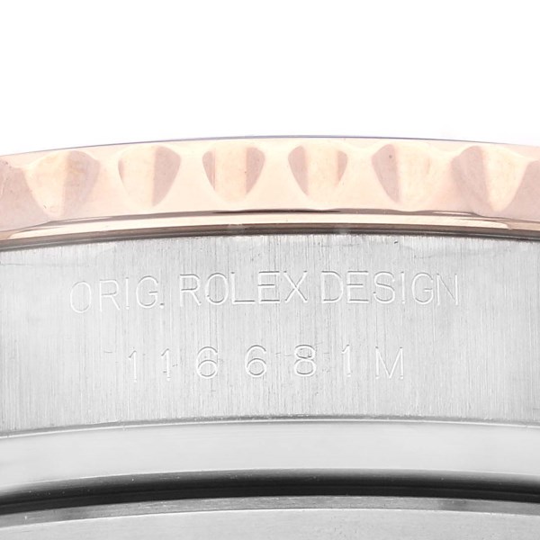 | Case: | Stainless steel and 18K rose gold case 44.0 mm in diameter. Screw down crown and caseback. Rolex logo on the crown. |